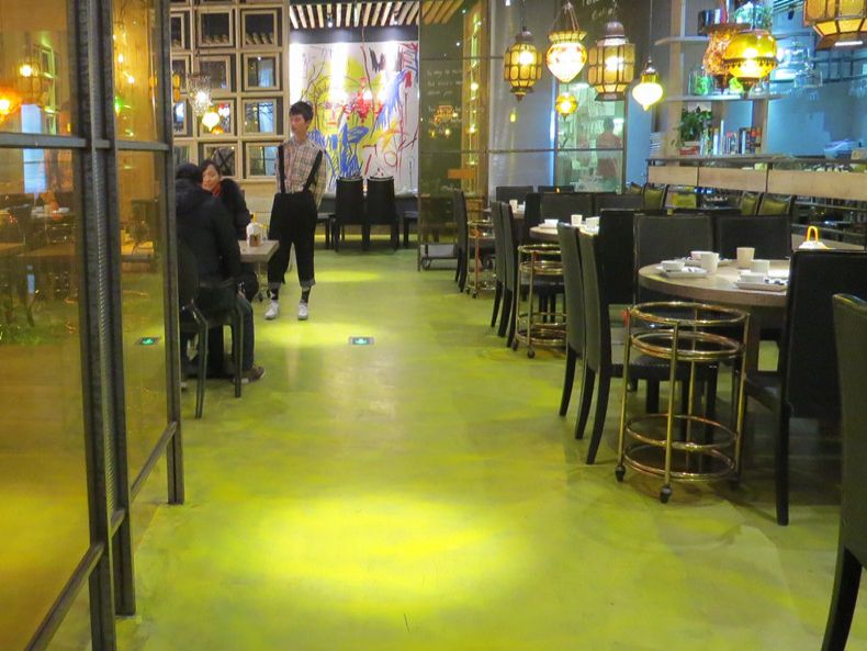 環保要求高的食品生產廠、餐廳藝術地面、咖啡廳地面、酒店酒吧藝術地坪、辦公室家裝地面墻面、繪畫展示廳、電影院等場所。