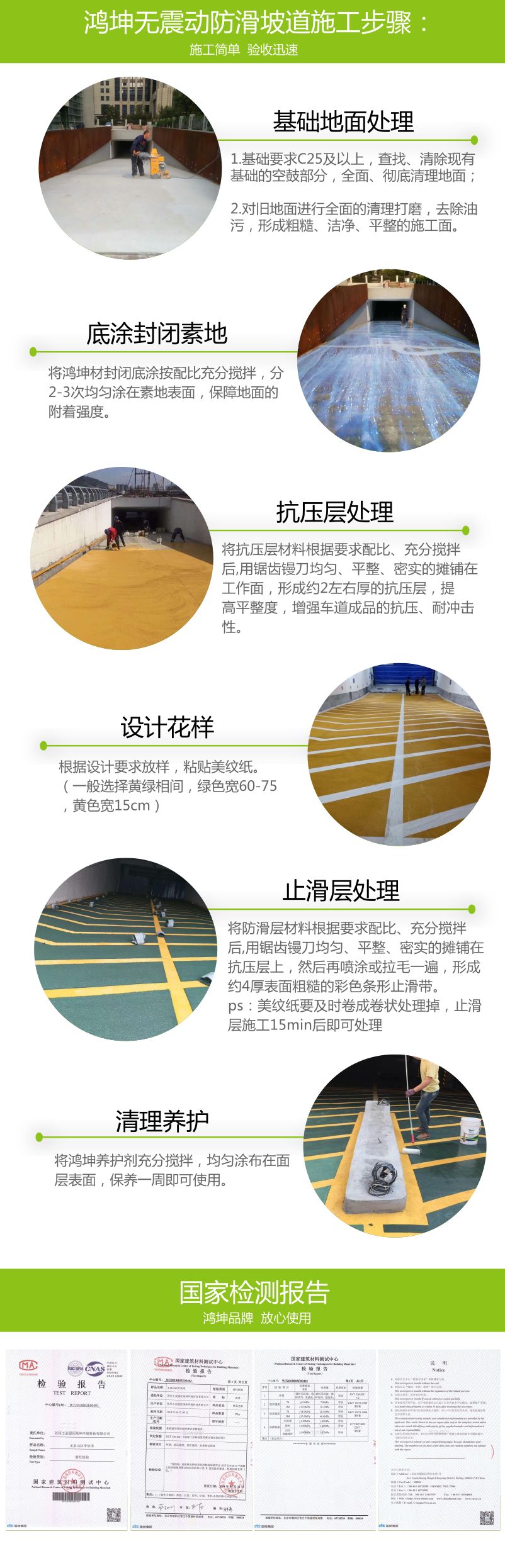 鴻坤無震動止滑車道是由特殊骨料與特種水泥、顏料及添加劑組成。現(xiàn)場添加水性樹脂混合后攤鋪。