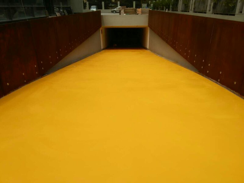 一般抗壓層用黃色骨料來施工,采用水性樹脂按比例加入清水,然后添加黃色骨料進行攪拌,攪拌均勻后批刮在坡道表面;