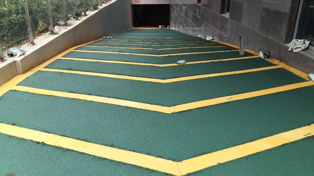 抗壓層用于保護基礎地面不被磨損,一般使用黃色骨料添加水性樹脂進行攪拌施工。止滑層作用于表面,增加表面的防滑效果,美觀安全,車輛行駛有一定的舒適感。