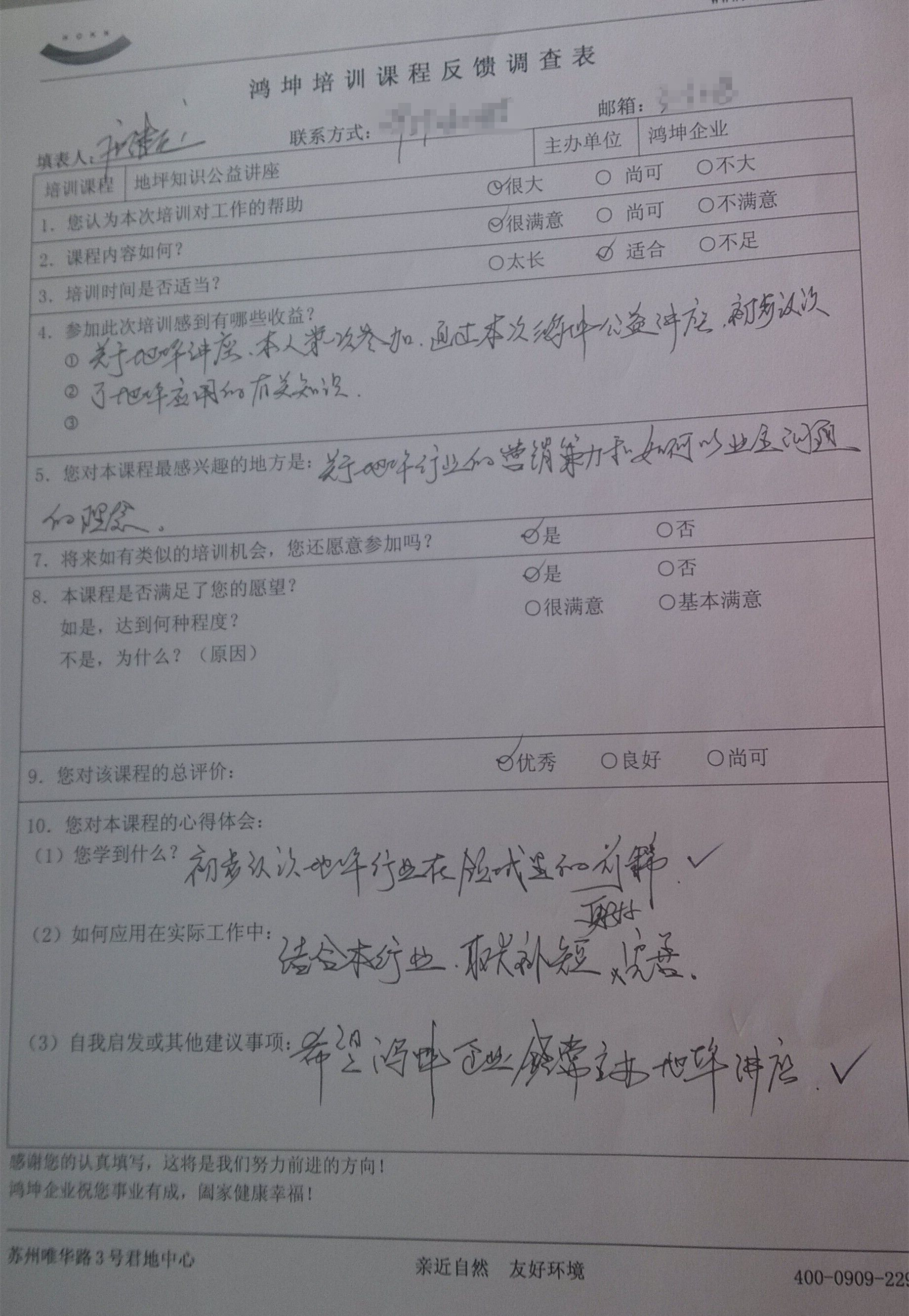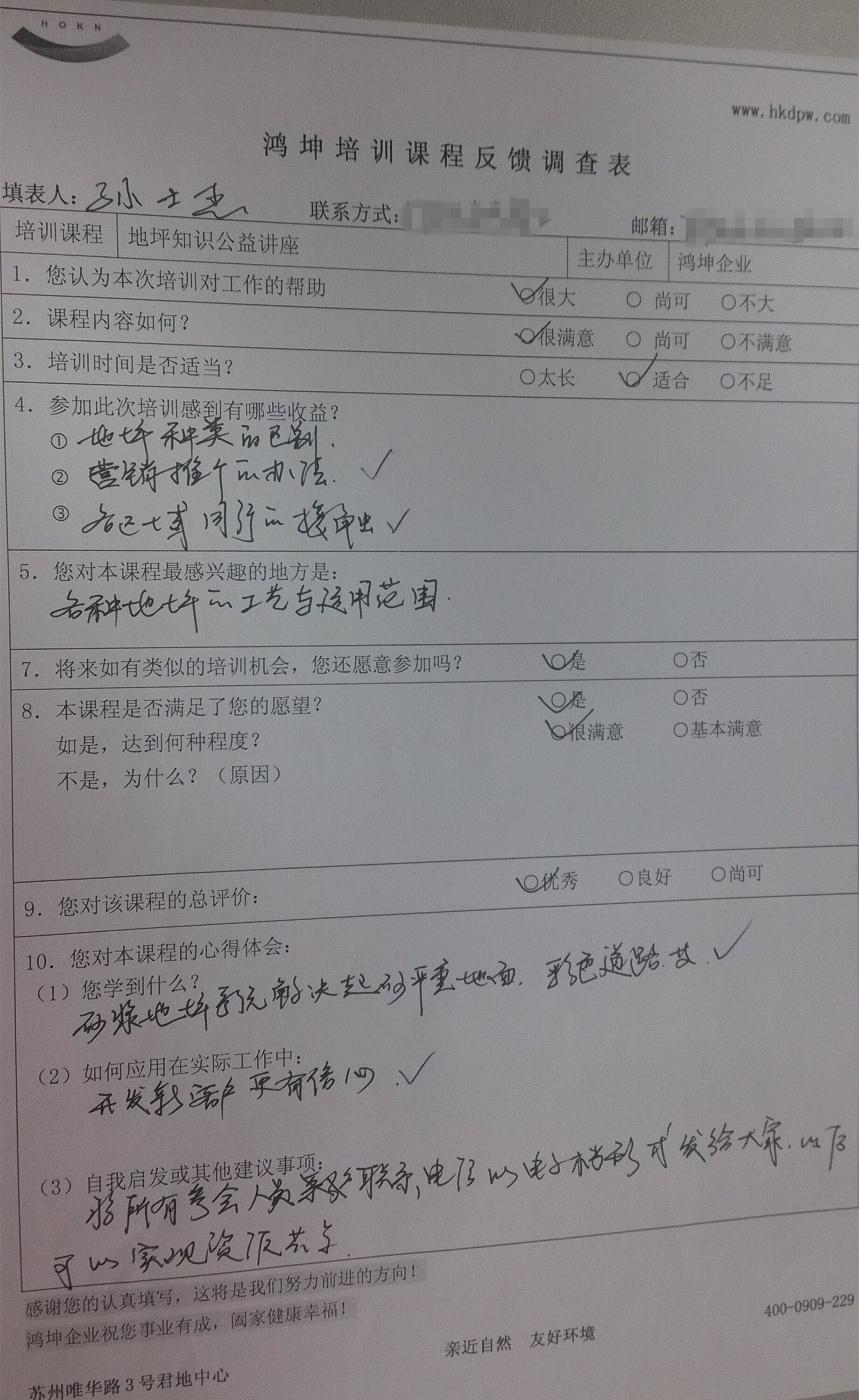南京林總對于鴻坤企業第三期地坪知識講座認為對工作幫助很大,對我們設置的課程內容很滿意,培訓時間適合。 鴻坤企業:參加此次培訓感到有哪些收益?南京林總:1.產品的特性;