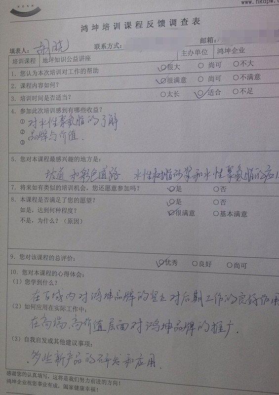 武漢胡曉經理對于鴻坤企業第三期地坪知識講座認為對工作幫助很大,對我們設置的課程內容很滿意,培訓時間適合。 鴻坤企業:參加此次培訓感到有哪些收益?武漢胡曉經理:1.對水性聚